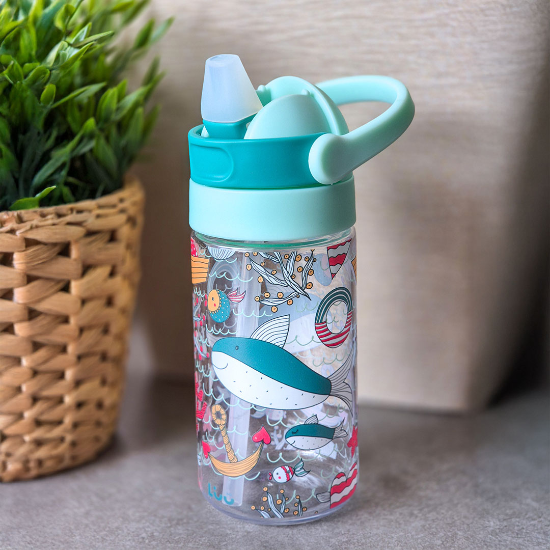 בקבוק שתייה עשוי פלסטיק איכותי מסוג טריטן, נטול BPA ועומד בתקן מזון ישראלי (5113). בעל קיבולת של 480 מ״ל, עם פיה נשלפת שנפתחת בשליפה – נוח לשימוש לילדים וללא צורך בהברגה.